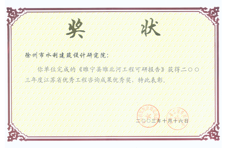 《睢北河工程可研報告》咨詢(xún)優(yōu)秀獎(2003)